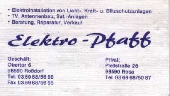 Die Firma “Elektro-Pfaff” ist ein Familienunternehmen, welches 1993 ihre Filiale in Rossdorf eröffnete. Seitdem hat sich das Unternehmen ständig vergrößert. Das Angebot an Waren sowie die Serviceleistungen werden regelmäßig erweitert und an die Bedürfnisse der Bevölkerung in Rossdorf und den umliegenden Ortschaften angepasst.